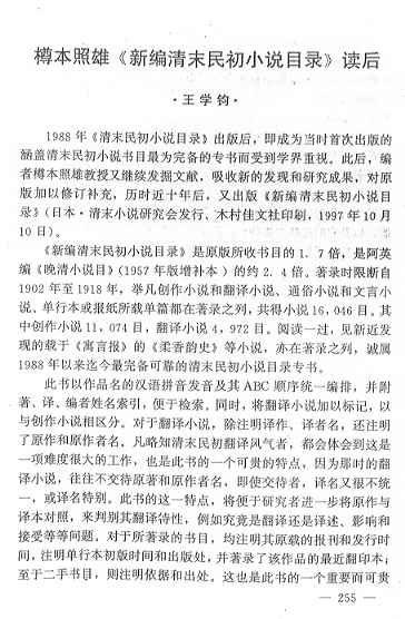 王学鈞「樽本照雄《新編清末民初小説目録》読後」