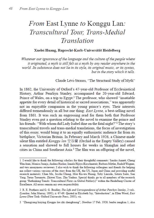 Xuelei Huang, From East Lynne to Konggu Lan: Transcultural Tour, Trans-Medial Translation, Transcultural Studies 2012. 2, Universitat Heidelberg