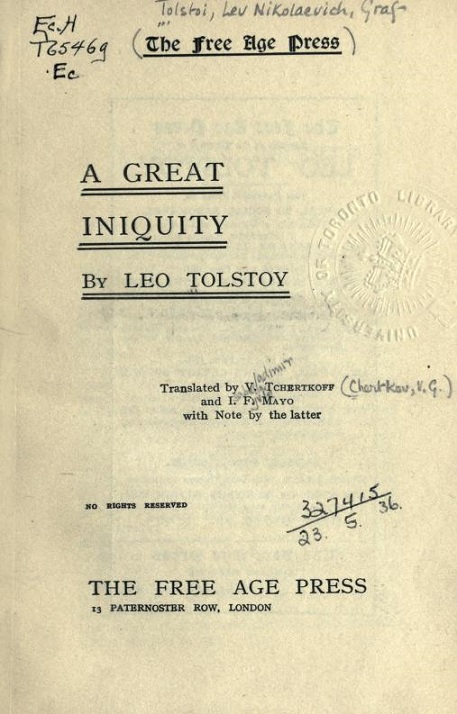 @©’FLEO TOLSTOY ìAV. TCHERTKOFF(VLADIMIR GRIGOREVICH CHERTKOV)AI. F.(ISABELLA FYVIE) MAYO ‰p–ógA GREAT INIQUITYhLONDON: THE FREE AGE PRESS,[1905?]jB‘æ1Í‚ðŠ¿–ó